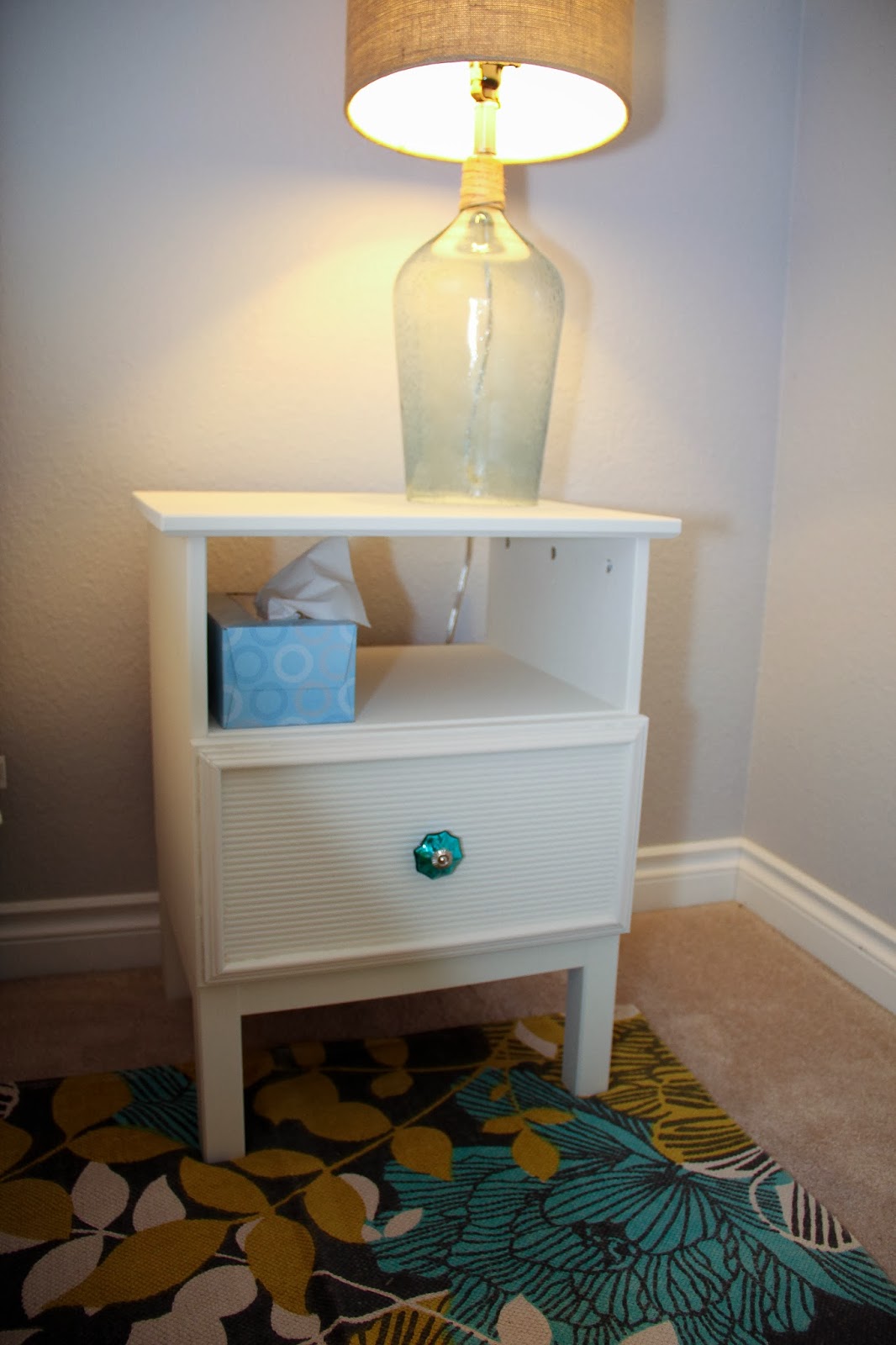 But decided against it after the white bed frame that I wanted wasn't in stock and had to get a black one instead. I just didn't want to have a black bed frame, white dresser and teal nightstand, it would look too crazy I think. So I decided to paint the nightstand white and then fancy it up. I thought grass cloth wallpaper would look cool but didn't want to spend so much to purchase an entire roll since I just needed a small amount. Then I decided to do nailhead trim. I love me some nailhead trim and had seen lots of DIY'd nailhead trim furniture.